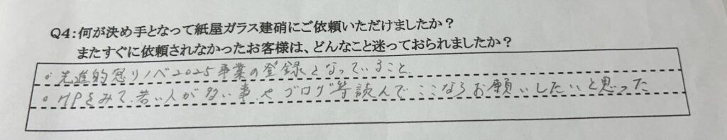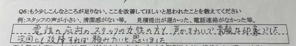 最近はひと月に10枚前後ですが、お客様からのお喜びの声のアンケートを頂戴しております。その中でも電話対応のスタッフから工事スタッフの対応までを褒めて頂けることもあり、我々にとってすごく励みになっております。